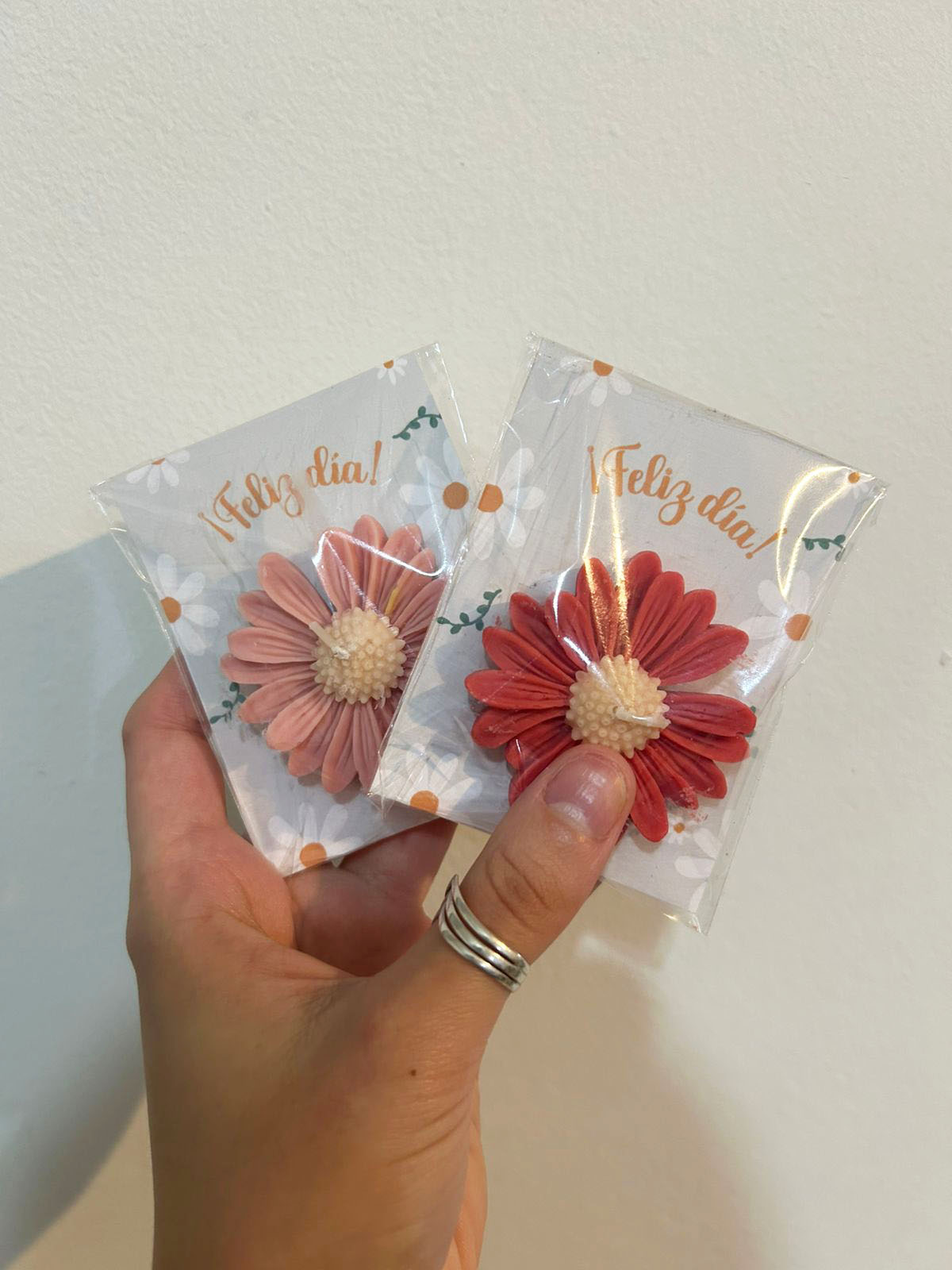 Vela en forma de margarita con tarjeta de ¡Feliz día! y bolsita de plástico