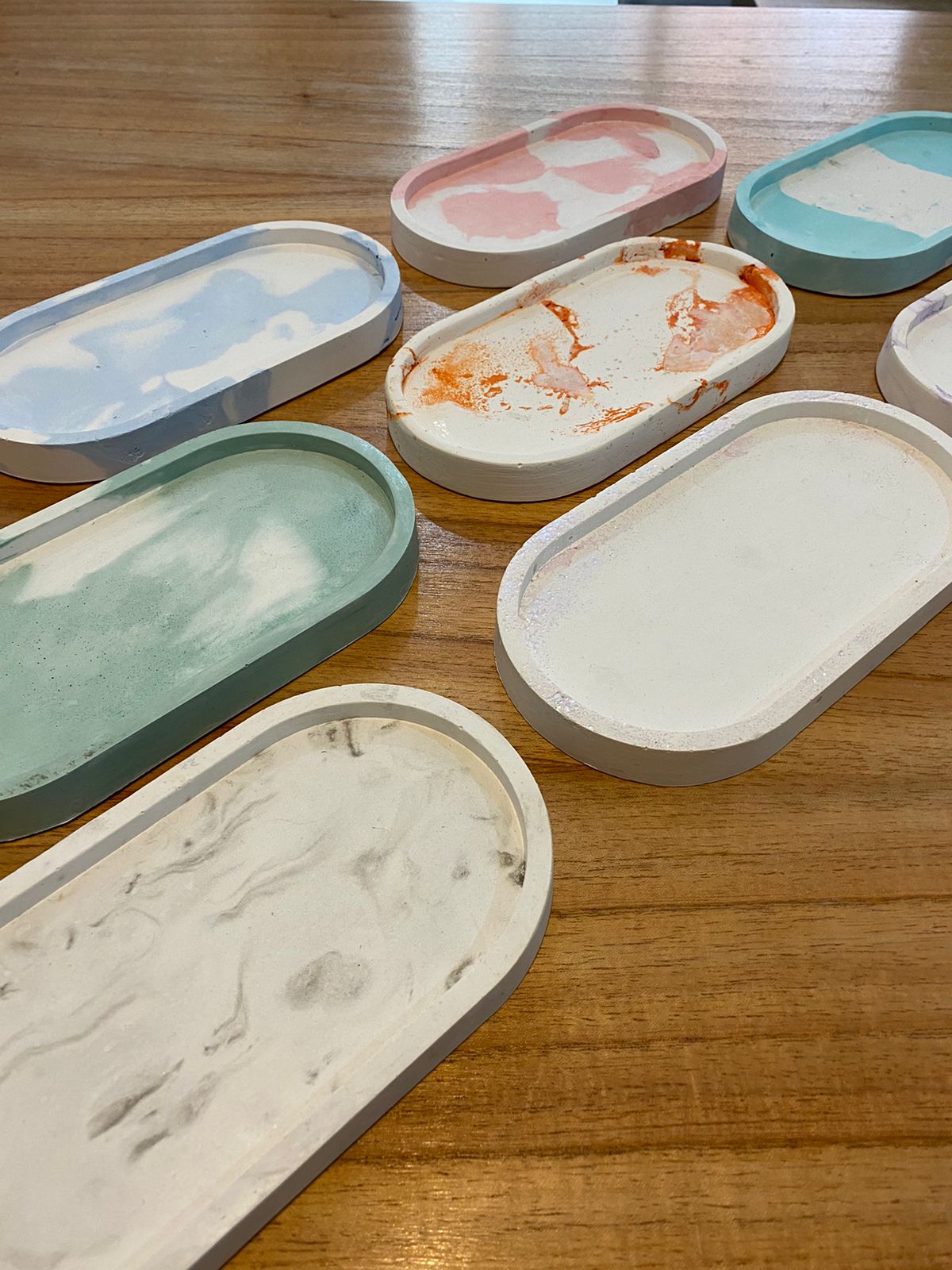Todos los colores son combinados con blanco. Producto hecho de manera artesanal, los colores y manchas son únicas de cada pieza.