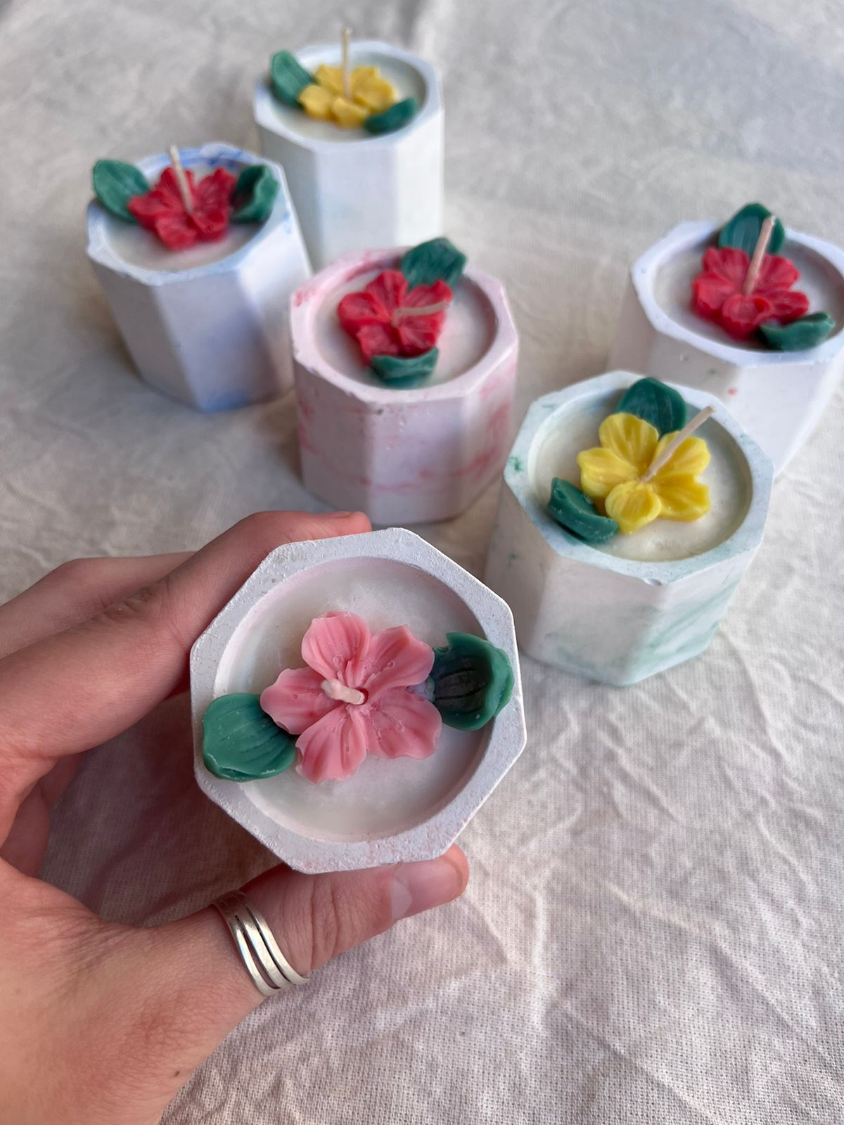 Vela con hibiscus, se puede elegir el color de la florcita.
